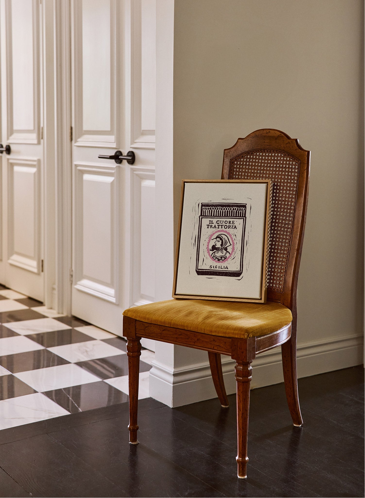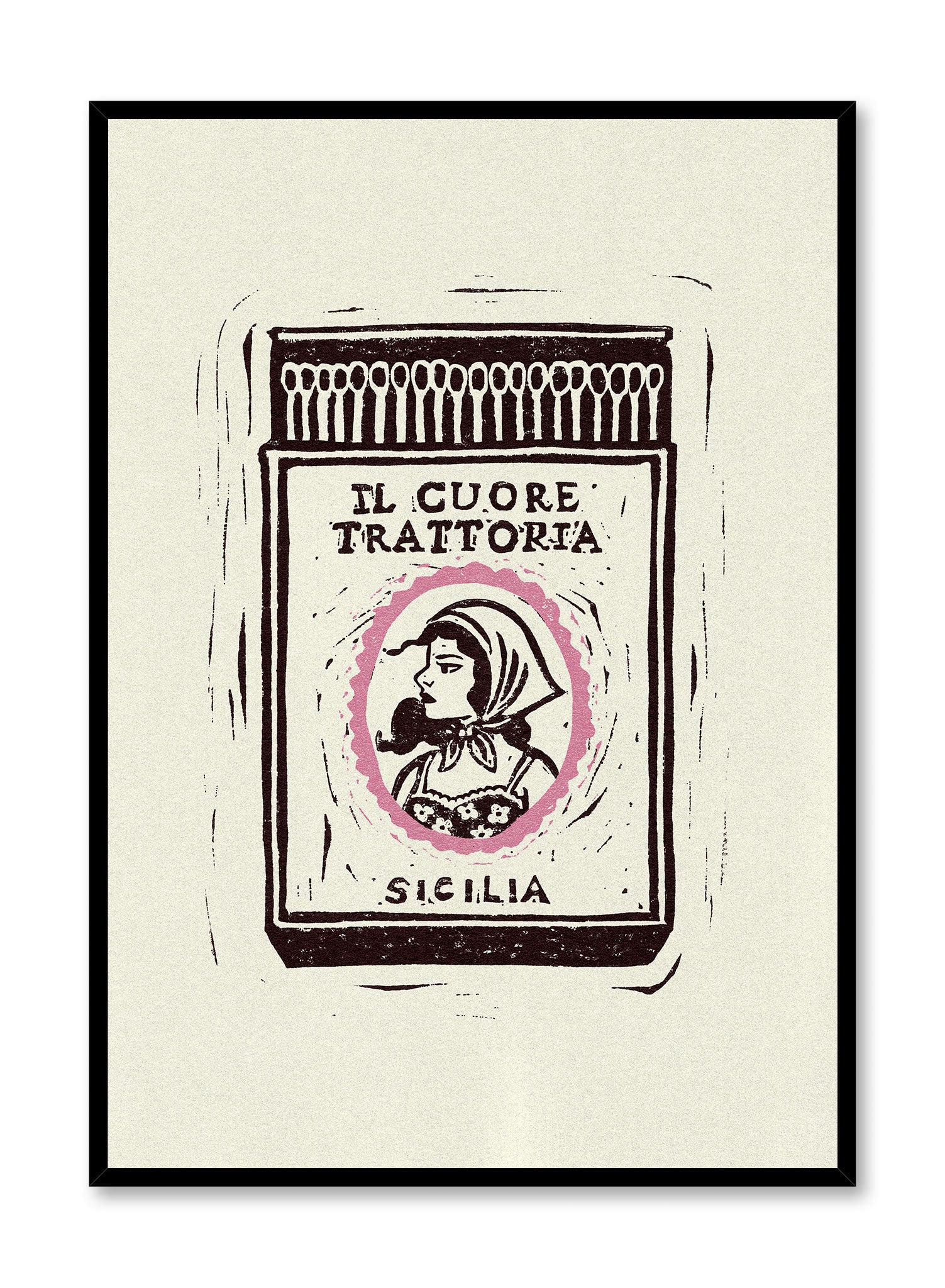This linocut print features a vintage-style matchbook from a fictional Sicilian restaurant, 'Il Cuore Trattoria,' which translates to 'The Heart Trattoria.' The label shows a classic portrait of a woman in a headscarf, framed by a delicate pink oval. The hand-carved aesthetic gives the piece a rustic and soulful quality, evoking the warmth of a family-run Italian eatery.