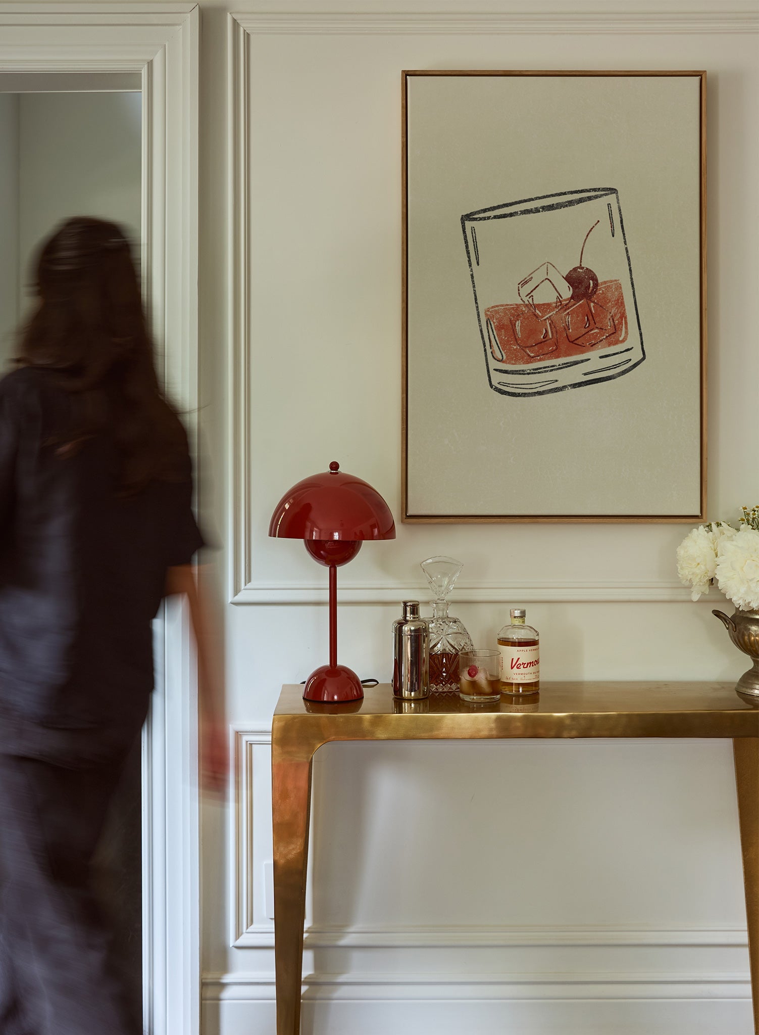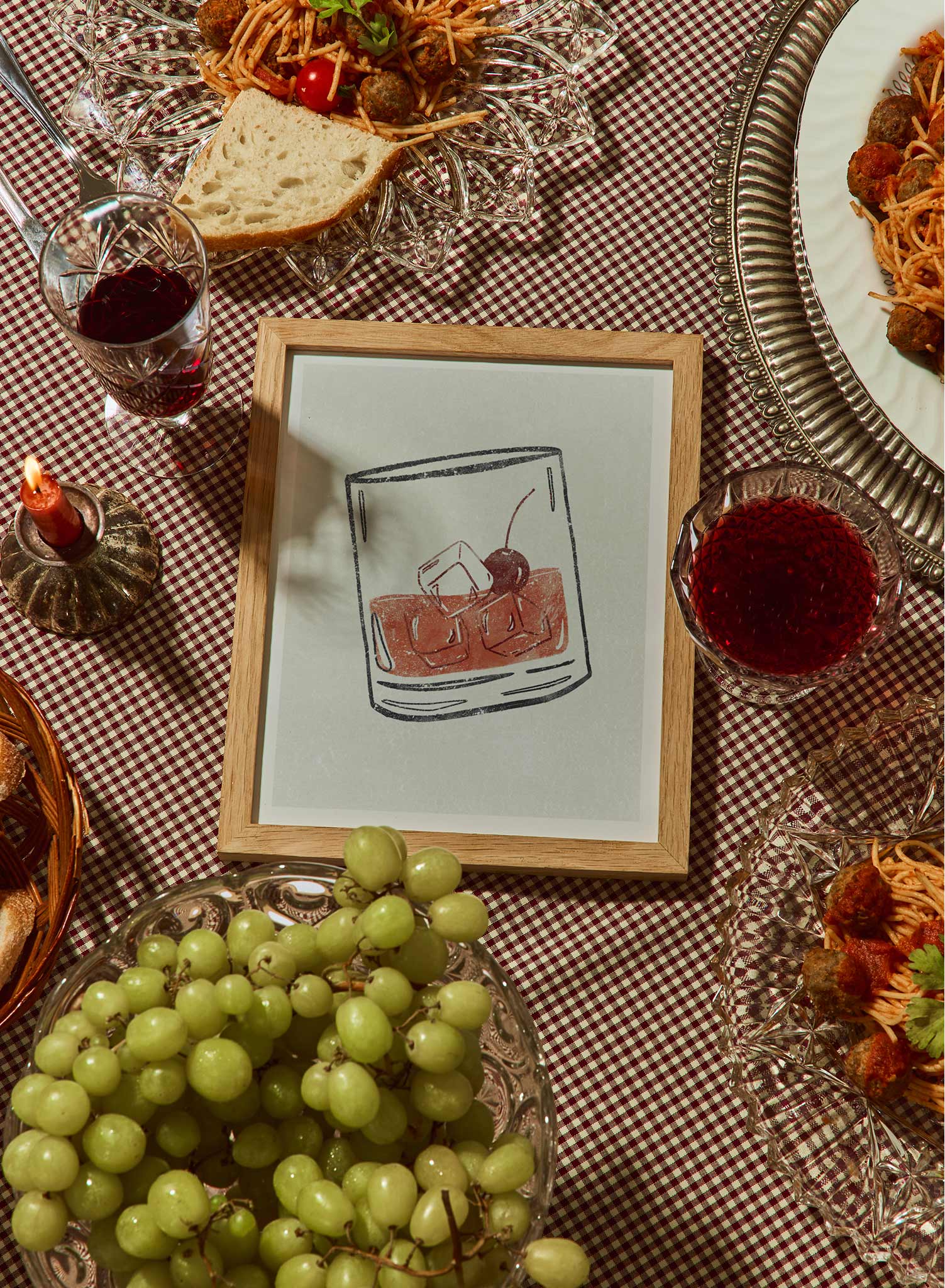 The minimalist color palette of black, red, and cream gives the print a versatile and sophisticated look. The linocut-style illustration has a rustic, artisanal quality that feels both modern and timeless. It’s a simple, stylish celebration of classic cocktail culture and the art of a well-made drink.