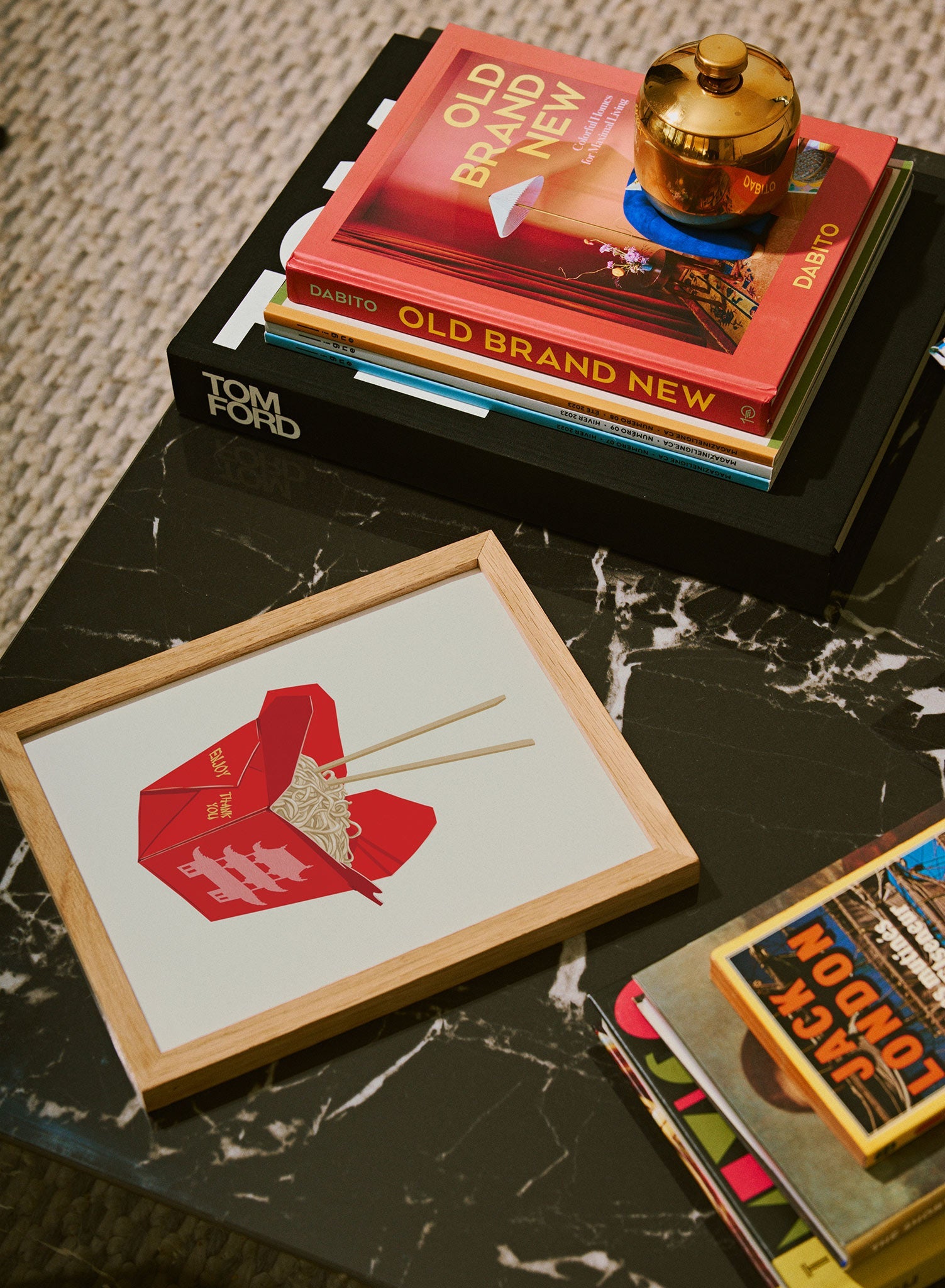 This art print is a stylish and modern tribute to the iconic Chinese takeout box. The clean, graphic illustration depicts the classic red container filled with noodles, complete with a pair of chopsticks ready to dig in. Small, thoughtful details like the pagoda motif and the 'Enjoy Thank You' text add a touch of authenticity to the design.